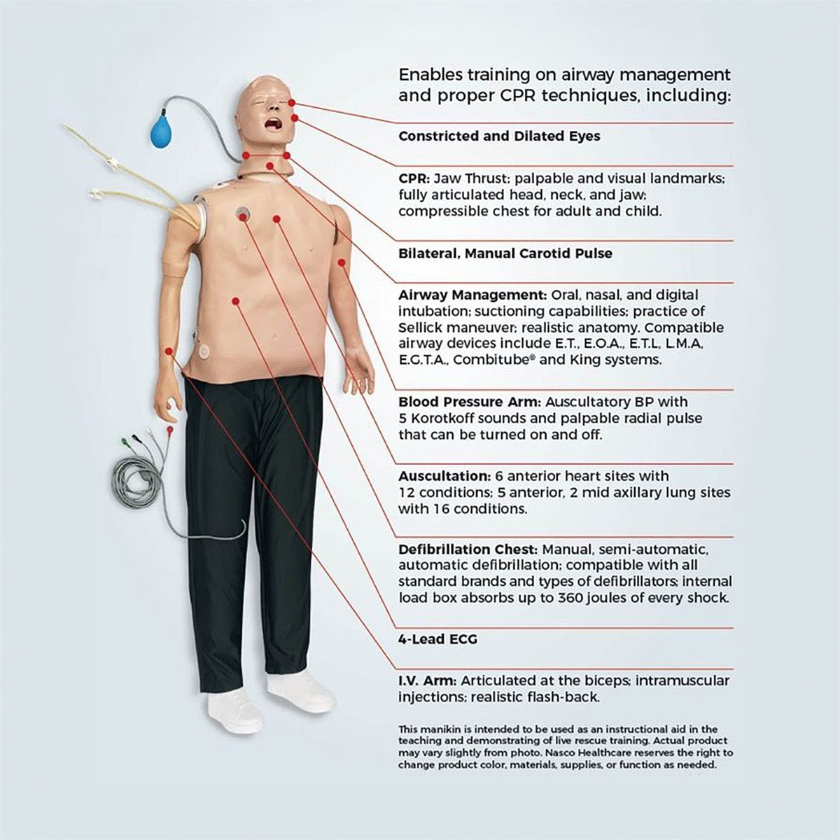 - Monitor manikin like a real patient at 4 ECG sites and 2 defibrillation sites.